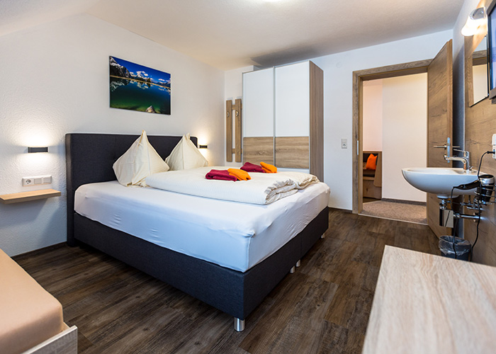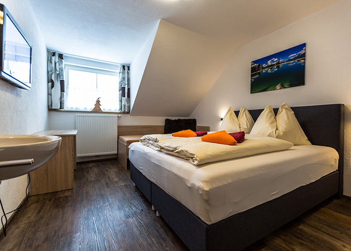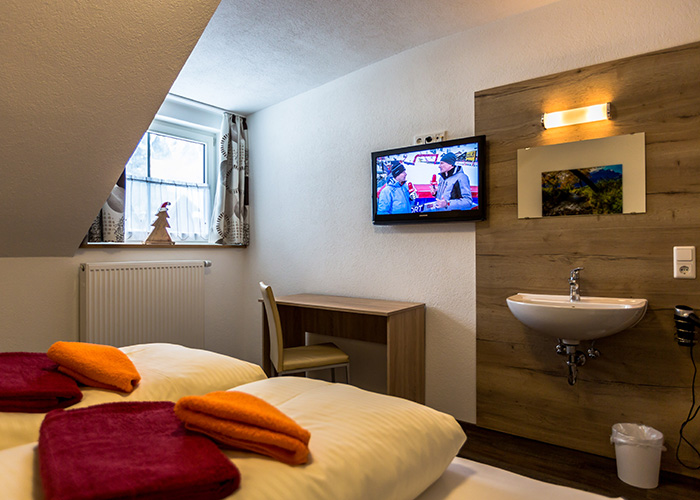 - Schlafzimmer mit Doppelbett und Einzelbett (Bettwäsche vorhanden), Waschbecken und Flat-TV